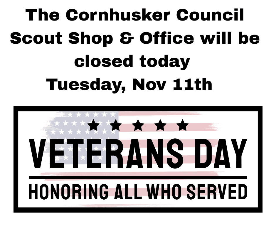The Cornhusker Council Scout Shop and Office will be closed on Tuesday, November 11th in honor of Veterans Day.