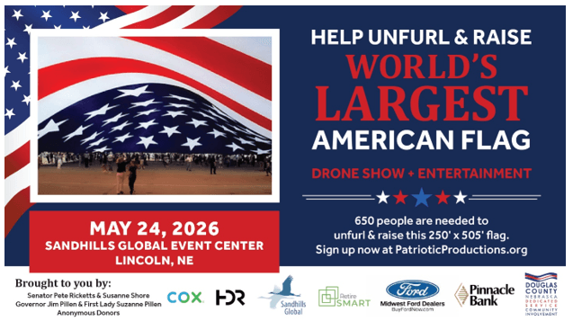 This Memorial Day Weekend, join us at the Sandhills Global Event Center as Patriotic Productions brings the World’s Largest American Flag to Lincoln — and this community event is completely FREE to attend and participate!